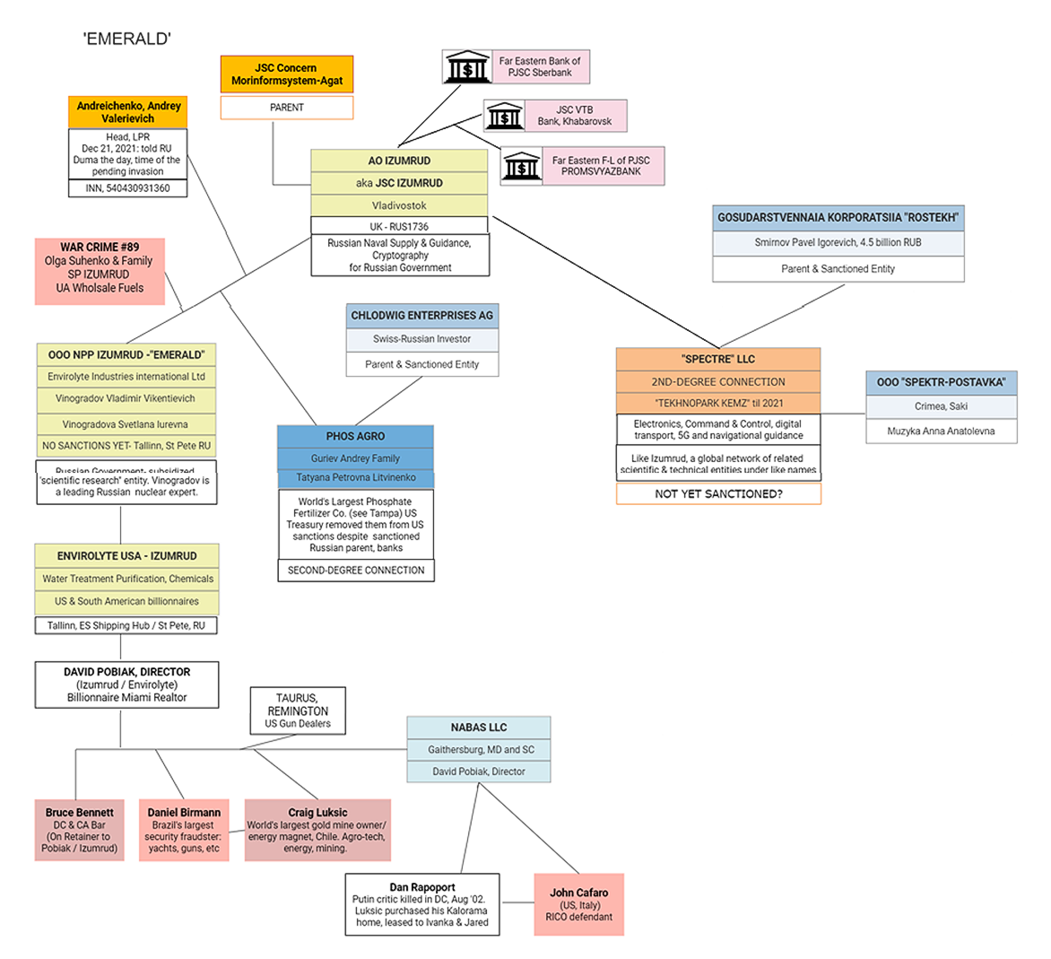 We began flagging EMERALD - a global conglomerate of inter-laced scientific, real estate, military supply chain, communications, internet, water purification, energy, and agricultural entities - to US and UK authorities as early as May 2022. When our company was approached or recruited to support the Russian military and banking communities, under the guise of US entities posing as US Government vendors. In February 2023, the UK Government formally sanctioned and charged with AML and other criminal violations, the first of the IZUMRUD ("Emerald") family of companies. EMERALD and its affiliated Russian companies - Rostekh, Spectre, Almaz-Almay - when combined with its global second-tier suppliers and customers, are embedded in almost every region of the world. Including heavy US, South American, and EU influence and supply chain and banking involvement.